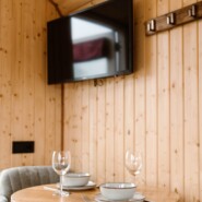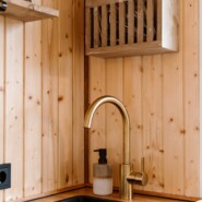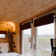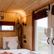 Een knusse wagen met voldoende ruimte voor 2 personen. Er is een klein keukenblok met servies, inductie kookplaat, een waterkoker en een koffiezetapparaat. Er is ook een klein koelkastje waar je het een en ander koel kunt bewaren. Verder is er stromend water met wasbakje, voorzien van een 10L warm water boiler.